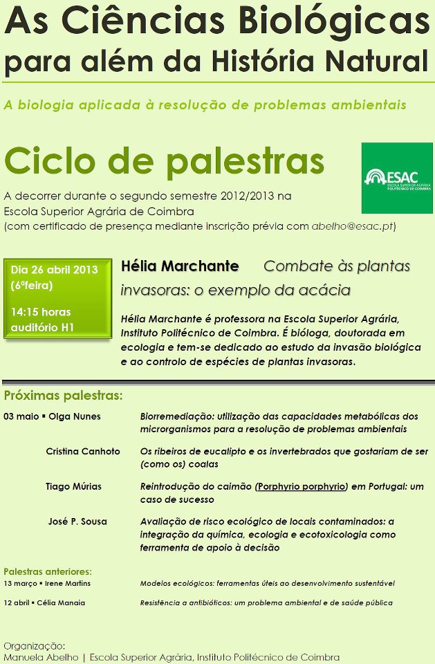 Esta apresentação faz parte do ciclo de palestras "As Ciências Biológicas para além da História Natural - A biologia aplicada a resolução de problemas ambientais", que decorre durante o segundo semestre na Escola Superior Agrária de Coimbra.
